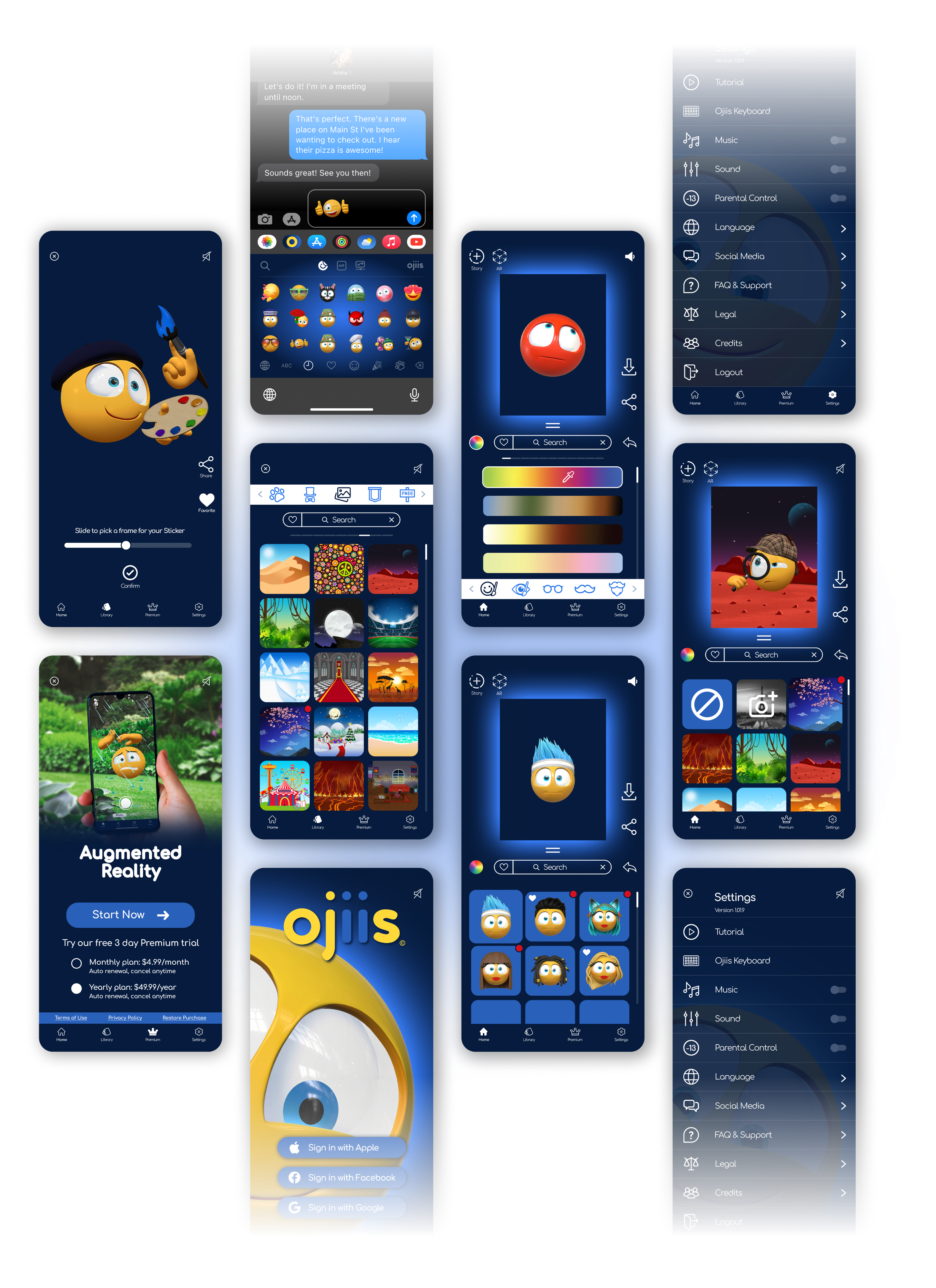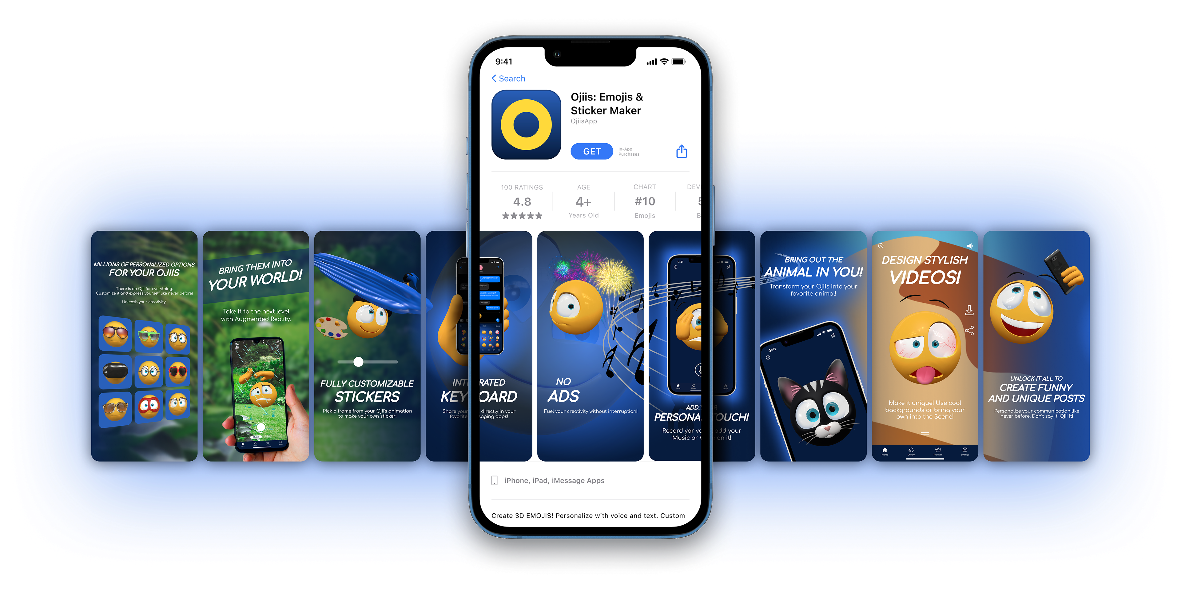The app store layout design for Ojiis showcases the app's standout features—custom emojis, animations, an integrated keyboard, and augmented reality—through a captivating and engaging presentation that reflects its vibrant and playful essence.